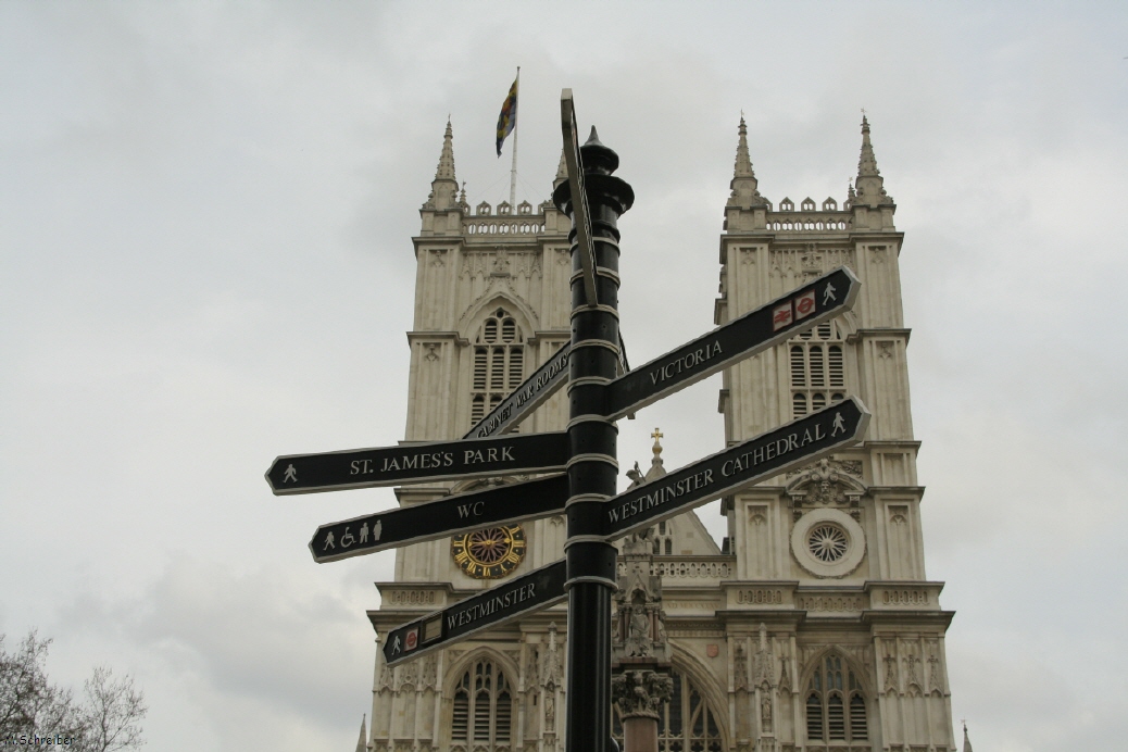 Da es mir jetzt wieder gut geht, besuchen wir Westminster Abbey und die daneben liegende St Margarete´s Church. Was ist denn hier los? Ist denn um diese Jahreszeit in London Karneval? Um Himmels Willen, das soll eine Hochzeit sein. Die arme Braut - nicht das die abhaut wenn sie die ganzen Gäste hier sieht. Die Kleider der Gäste sehen aber auch wirklich grausig aus - entweder wie bei uns in der Altkleidersammlung oder in diversen Karnevalskisten. Am Schlimmsten finde ich die Frau mit dem giftgrünen Kleid und einem schwarzen Hütchen. Die schneeweißen Beine passen perfekt zu dem restlichen Anblick - Hilfe! Wir warten auf die Braut - das wollen wir sehen. Punkt 15 Uhr trifft sie ein. Allerdings ist sie und auch die Blumenkinder hier und heute anscheinend die Einzigste die wirklich ganz süß aussieht. Das beruhigt mich wieder ein bißchen.