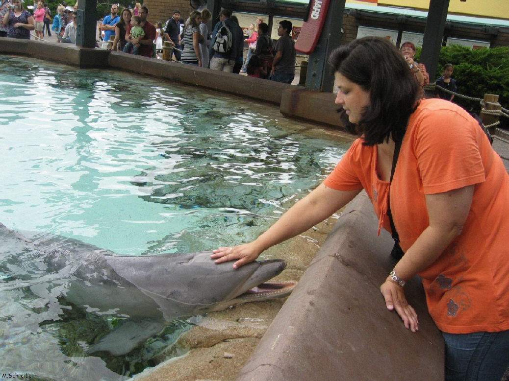 Wir beschließen Richtung Delfine zu gehen, da das ja auch der Grund war, weshalb Michelle unbedingt hier hin wollte. Direkt hinter den putzigen Seeottern ist das Delfinbecken. Sind ja schon tolle Tiere - Michelle ist ganz fasziniert. Wir haben schon 10 Uhr und da um 10.30 Uhr die Fütterung beginnt, wollen wir so lange warten. Das stellt sich als sehr gut heraus, denn schon 10 Minuten später bilden sich endlos lange Schlangen um das ganze Gebäude herum. So ganz ohne Anstellen geht es hier also auch nicht. Um punkt halb 11 Uhr wird die Absperrung geöffnet. Wir haben Glück, dass wir als Zweites dran sind. Der Spaß kostet 6 Dollar pro Person und wer nicht zahlt, muss draußen warten, nur fotografieren geht nicht. Egal, dass muss sein. Wally möchte lieber warten aber Adolf kommt auch mit. Jeder bekommt 3 Fische und kann damit einen Delfin füttern und jeweils nach dem Fisch auch streicheln.