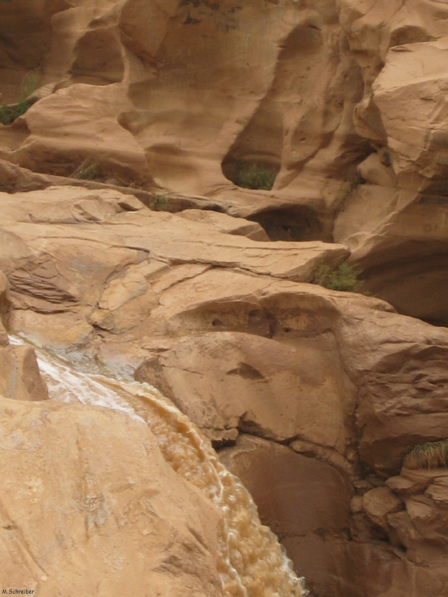 So richtig überblicken kann ich das ganze aber erst als ich oberhalb des Falls auf die Klippe klettere. Das ist durch den extrem glatten Sandstein gar nicht so einfach. Von hier oben sieht man den Miniwasserfall, der allerdings trotzdem eine ganz schöne Kraft hat.