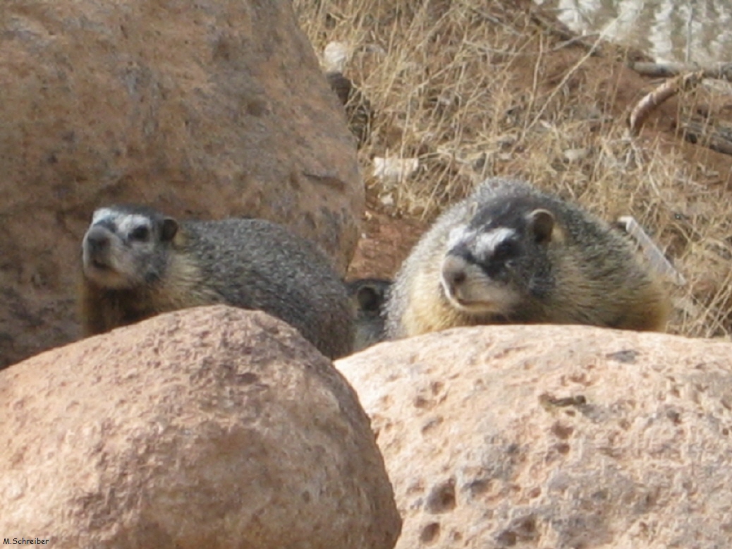 Wir schleichen uns heran und tatsächlich nachdem wir eine Weile unbewegt oberhalb vom Fluß stehen, kommt eine ganze Schar Murmeltiere aus den Höhlen. Nach ein paar Minuten überquert sogar ein Maultierhirsch direkt vor uns den Fluß und man sieht natürlich jede Menge Squirrels - wo auch nicht?